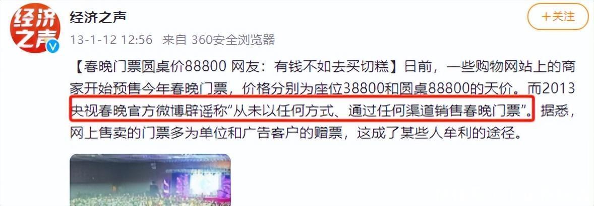 在2013年春晚开播的前十几天时,网上就运行络续的走漏出好多“交易春晚门票”的商家,不仅打出“保证有票”的牌子,以致还贴出了所谓的“春晚完竣节目单”。